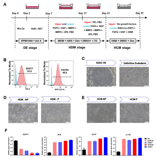 Generation of the polarized hEHs through the transwell−based polarized differentiation (A) Schematic representation showing the differentiation protocol to generate the polarized hEHs. (B) Flow cytometry determined the proportion of SOX17+ and CXCR4+ cells in DE cells. (C–E) Sequential morphological alterations of the nonp−olarized and polarized hEHs during the hepatic differentiations. (F) Quantitative PCR analysis of DE cell markers and hepatic−lineage markers in DE cells, the non-polarized hEHs and polarized hEHs cultured with HDM medium, the non−polarized hEHs and polarized hEHs cultured with HCM medium. The aforementioned cells were sampled for quantitative PCR analysis at days 7, 21 and 27 during the hepatic differentiation. Relative gene expression represents data normalized to GADPH and calibrated to DE cells. Data represent the mean ± SD.
