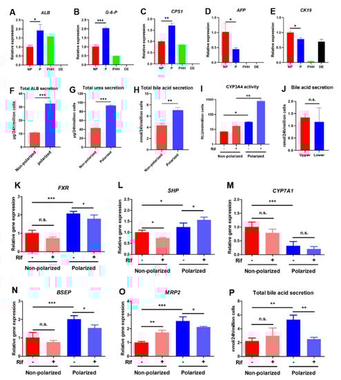 The effects of polarized differentiation on the maturation and function of hEHs. (A–E) Quantitative PCR analysis of hepatic maturation-related genes (ALB, G−6−P, CPS1, AFP and CK19) in the non-polarized and the polarized hEHs. Relative gene expressions were normalized to GADPH and calibrated to the non-polarized hEHs. (F) ELISA analysis of the total ALB secretion in the non-polarized and polarized hEHs at day 27 after the differentiation. (G) Analysis of the total urea secretion by commercial Urea Nitrogen Assay Kit in the non-polarized and polarized hEHs at day 27 after the differentiation. (H) Analysis of the total bile acid secretion of the non-polarized and polarized hEHs by using Total Bile Acid Kits. (I) Assessment of CYP3A4 activity of the non-polarized and polarized hEHs by commercial P450−GloTM Assay Kit in the presence of Rif for 2 days using fluorescence-based assays. (J) Analysis of the directional secretion of the bile acids in the polarized hEHs by using Total Bile Acid Kits treated with Rif for 2 days. (K–O) Quantitative PCR analysis of hepatic bile acid metabolism related genes and apical transporters of the non-polarized and polarized hEHs in the presence or the absence of Rif for 2 days. Relative gene expression represented data normalized to GADPH and calibrated to the non-polarized hEHs without the induction of Rif. (P) Analysis of the total bile acid secretion of the non-polarized and polarized hEHs by using Total Bile Acid Kits in the presence or the absence of Rif for 2 days. Data represent the mean ± SD. * p < 0.05, ** p < 0.01, *** p < 0.001; n.s. means no significant.