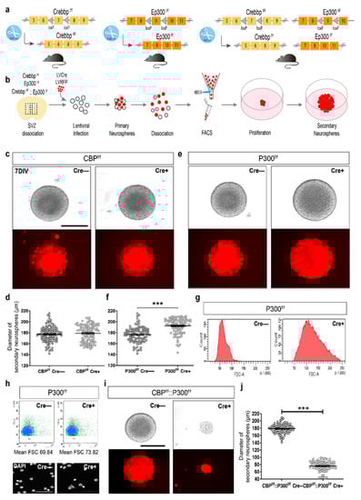 To generate neurospheres lacking CBP, p300, or both, we isolated NSCs from the SVZ of Crebbpf/f, Ep300f/f, and Crebbpf/fxEp300f/f newborn mice (P0–P3) and infected them with a lentiviral vector encoding either the red fluorescent protein (RFP), as a control, or a Cre recombinase fused to mCherry to target the floxed alleles. Cells were then seeded in growth medium supplemented with epidermal growth factor (EGF) and fibroblast growth factor (FGF) as mitogens in the absence of adherent substrate (Figure 1b). After 2 weeks in culture to allow complete removal of KAT3 proteins, primary neurospheres were isolated by fluorescent-activated cell sorting (FACS) and replated to generate clonal secondary neurospheres. Next, we measured neurosphere diameter as an approximation to quantify cell proliferation []. CBP-lacking neurospheres showed similar diameters to control neurospheres after 7 days in culture post sorting (DIV7) (Figure 1c,d), suggesting that CBP does not interfere with proliferation. However, in the case of p300, we observed an increase in the diameter of the neurospheres (Figure 1e,f). To test whether this increase in diameter was a consequence of a larger cell size or a higher proliferation rate, we quantified the number and size of p300-ablated NSCs by FACS. We did not find significant differences in cell number (19,397 ± 637.5 vs. 19,453 ± 522.5, p = 0.9488). However, NSCs lacking p300 presented a slightly larger cell size (137.193 ± 36.646 vs. 64.744 ± 16.959, p < 0.0001) and nucleus size (mean 73.82 ± 14.677 vs. 69.84 ± 6.454, p < 0.0001) compared to controls (Figure 1g,h). This result suggests that p300 elimination impacts cell size but does not affect the proliferation of NSCs. Importantly, neurospheres with both CBP and p300 depleted showed a great reduction in diameter compared to control neurospheres (Figure 1i,j). Overall, these results indicate that, whereas proliferation of NSC is not affected by the absence of CBP or p300, simultaneous removal of both proteins seriously compromises proliferation and self-maintenance, indicating that the presence of at least one of the two KAT3 proteins is required for NSC proliferation.