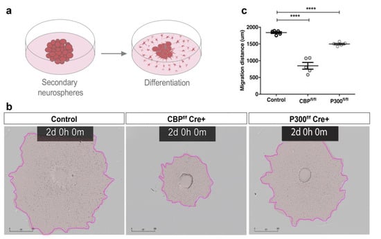 CBP-lacking neurospheres showed a prominent delay in cell differentiation and alterations in neural lineage markers. (a) Scheme representing differentiation of clonal secondary neurospheres. (b) Overlaid brightfield depicting cell migration obtained by real-time IncuCyte imaging at 48 h. (c) Quantitative analysis of cell migration (μm) after 48 h (n = 5 per genotype). CBP-lacking neurospheres showed a prominent delay in cell migration, whereas p300-lacking neurospheres exhibited a slightly reduction compared to control neurospheres. Scale bar: 800 µm. **** p < 0.0001.
