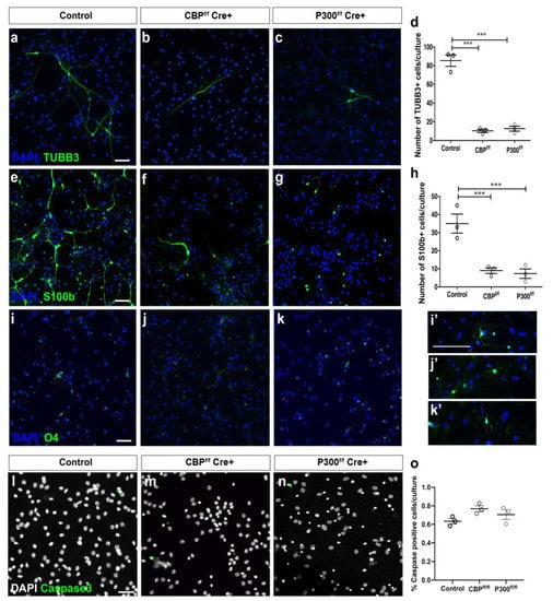 After maintaining the cultures of CBP-KO, p300-KO, and control neurospheres for 15 DIV, we performed immunostaining with TUBB3, to label differentiating neurons, and GFAP, which is a stemness marker at early stages of differentiation and labels astrocytes at later stages. Control cultures stained with GFAP exhibited typical stellate with large filamentous morphology while a non-ramified morphology and low level of GFAP immunoreactivity were observed in neurospheres lacking CBP or p300 (Figure 3a–c’) (0.78 fluorescence intensity (arbitrary units) ± 0.018 (SEM)/nuclei (DAPI) in the control vs. 0.017 ± 0.035/nuclei in CBP-ablated and 0.01 ± 0.022/nuclei in P300-ablated samples; p < 0.0001). Furthermore, in the CBP-KO and p300-KO cultures, there were very few TUBB3+ cells, suggesting that neural progenitors lacking CBP or p300 do not differentiate properly into neuronal fate (Figure 3d–f, Figure 4a). We also stained with markers for mature astrocytes (S100ß) and oligodendrocytes (O4) and found cells positive for each of these markers in the control cultures in the expected proportions [,]. However, there was a significant loss of TUBB3+ cells in CBP- and in p300-lacking cultures compared to the controls (Figure 4a–d) and a dramatic decrease in the proportion of S100ß+ cells in both CBP and p300 mutant cultures (Figure 4e–g). As in the controls, cultures lacking CBP or p300 showed fewer than five O4+ cells per plate (Figure 4i–k’). We also measured cell death after the elimination of CBP and p300 and observed no significant changes in the number of dying cells in either of the two genotypes compared to the controls (Figure 4l–o).