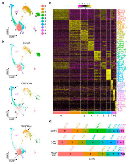 To explore the molecular changes underlying the morphological alterations observed in the CBP- and p300-deficient cultures, we conducted single-nucleus RNA sequencing (snRNA-seq) in the differentiation-induced cultures. After quality control (Figure S2), nucleus filtering, and joint analysis of samples from the two conditions and the controls, we performed unsupervised consensus clustering to identify major cell types and canonical marker genes (Supplementary Table S1). The integrated bioinformatic analysis identified 12 clusters (Figure 5a) that were annotated to 10 cell types according to the top 20 bona fide marker genes per cluster from the scRNA-seq dataset of the Allen Brain Map portal [] and markers from the Atlas of the Developing Mouse Brain [] (Figure 5b). Gene expression in these clusters identified cluster 2 as glial/astrocyte progenitor cells (GPC) (Mgat5 and Aqp4), cluster 3 as astrocytes (Slc1a3, Gpc5, and Atp1a2), cluster 4 as oligodendrocyte progenitor cells (OPC) (Bcas1, Sirt2, and Enpp6), cluster 5 as immature neurons (INMN) (Kcnj6, Nell2, and Cacng4), cluster 6 as oligodendrocytes (Mog, Mbp, and Mag), cluster 7 as proliferating cells (Mki67, Kif4, and Rbfox1), cluster 8 as neurons (Ascl2, Cpn4, and Adarb2), and cluster 9 as microglia (Inpp5d, Fyb, and Fli1). The remaining clusters were not characterized by a single cell type, suggesting a spectrum of cells in transition between different states; cluster 0 appeared to be a mix of neuronal progenitors (NPCs) and OPCs, while cluster 1 appeared to be a mix of pluripotent stem cells and/or radial glial cells (PSCs/RGCs).