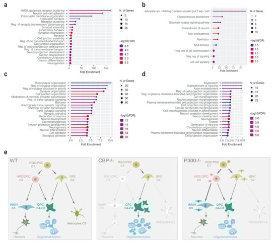 Next, we investigated the transcriptional alterations associated with CBP removal in the two clusters that displayed the strongest effect (cluster 0 and cluster 5) (Figure 6a; Supplementary Table S2). In the CBP-lacking cultures, 44 genes were upregulated and 66 were downregulated in cluster 0, while 112 were upregulated and 205 were downregulated in cluster 5. To identify biological processes affected by these transcriptional changes, we performed GO overrepresentation analysis. Downregulated DEGs in cluster 0 showed robust association with GO-BP terms (adj. p < 0.05) linked to neuronal functions, such as NMDA glutamate receptor clustering, neuron cell–cell adhesion, presynaptic membrane organization, glutamatergic synaptic transmission, and synapse assembly, including many well-known modulators of these processes such as Nrxn1, Grik2, Sema3d, Nlgn1, and Ntm. In contrast, the analysis of the upregulated genes (e.g., Mbp, Plp1, Tcf7l2, Bcas1, Sox6, and Sox10) retrieved terms related to oligodendrocyte fate such as oligodendrocyte development, ensheathment of neurons, axon ensheathment, or myelination (Figure 6a,b). GO analysis for cluster 5 also evidenced a clear trend for this population to adopt an oligodendrocytic lineage to the detriment of neuronal markers because there was a highly significant enrichment of upregulated genes in myelination, ensheathment of neurons, or axon ensheathment terms and an enrichment in terms such as post-synapse organization, regulation of synapse organization, modulation of chemical synaptic transmission, chemical synaptic transmission, or neuron development among the downregulated DEG (Figure 6c,d). In contrast to the CBP-lacking cultures, the upregulation of genes associated with the oligodendrocytic lineage was not evident in any of these two clusters in the p300-ablated cultures. Together, these results confirm the key role for CBP in the regulation of gene programs implicated in neuronal/oligodendrocyte lineage decision and the different function for p300 in the differentiation of NSC.