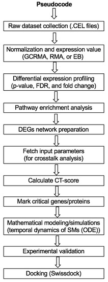 Here, is crosstalk degree between two pathways, is the number of nodes associated with the selected node, and means how many pathways share the selected nodes. represents total connectivity within the DEGs’ network, stands for total number of links for source node, and stands for total number of links for target node. Thickness of the connecting links between the pathways has been generated based on the , which is based on the overall . The generalized workflow of this work has been presented in Figure 1 (Analysis of crosstalk between the pathways).
