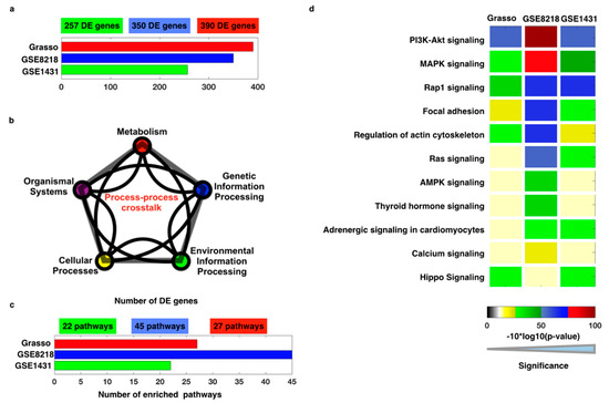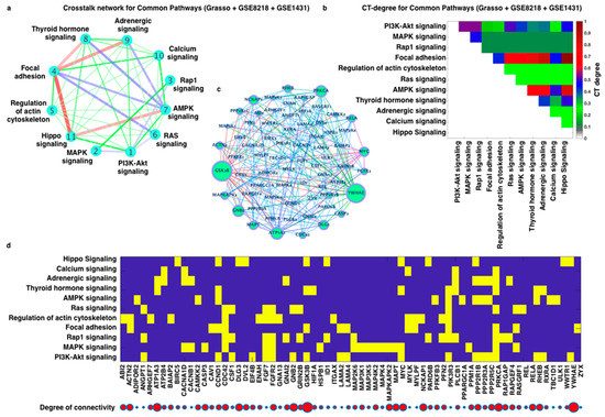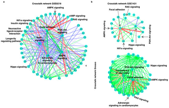 Since a large number of enriched pathways were evident in all three individual datasets, to unravel more comprehensively the crosstalk between the enriched pathways, all the DEGs of the three datasets were combined into one list, and we further calculated the for all the enriched pathways (Figure 4a–c).