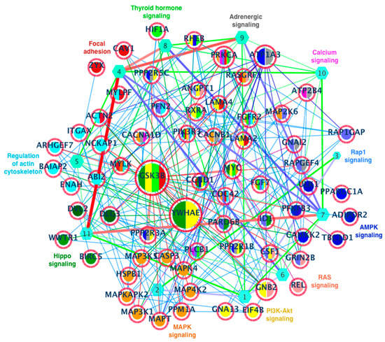 Crosstalk between the common enriched pathways: Pathway–pathway interactions together with the corresponding genes. The hexagonal nodes with number 1–11 represent the pathways, and the genes with more than one color mean that they are shared by more than one pathway. The higher the size of circular nodes (genes), the higher the degree of connectivity.