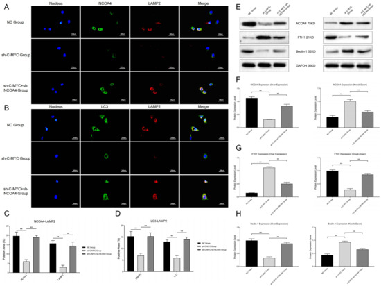 (A,B) Co-localization analysis of ferritin autophagy pathway factors (NCOA4 and LC3 vs. LAMP2). (C,D) Statistical analysis of co-localization expressions. (E) Western blot assays of ferritin autophagy pathway factors (NCOA4, FTH1 and Beclin-1). (F–H) Statistical analysis of ferritin autophagy pathway expression (** p < 0.01).