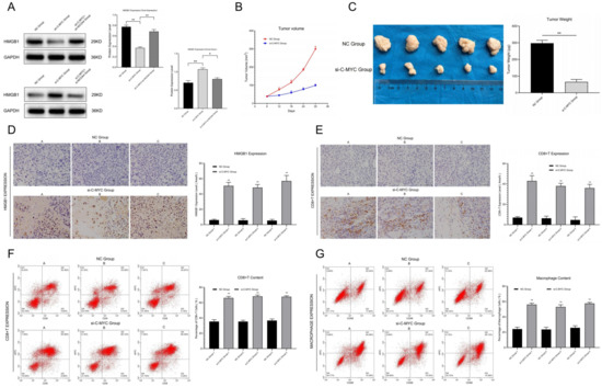 (A) Detection and statistical analysis of HMGB1 content in the supernatant of ovarian cancer cells after transfection. (B) Tumor growth curve in vivo condition. (C) Detection of tumor weight in in vitro condition and data analysis. (D) Relative HMGB1 expression between NC Group and si-C-MYC Group were detected and analyzed by means of immunohistochemistry. (E) Immunohistochemical staining and analysis of immune infiltration between the NC group and the si-C-MYC group (CD8+T). (F,G) Detection of CD8+T/macrophage cells through flow cytometry and statistical analysis (* p < 0.05, ** p < 0.01).