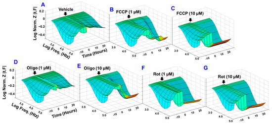Bioimpedance analysis of the effects of different mitochondrial inhibitors on the barrier function of HRECs using the ECIS technology. Three-dimensional analysis was prepared by plotting the log of normalized impedance (Y-axis) as a function of both log frequencies of 1 µA alternating current (AC) on the X-axis and time on the Z-axis. HRECs were treated with the vehicle (DMSO; A) and different concentrations of mitochondrial inhibitors: FCCP (1 and 10 µM; B and C, respectively), oligomycin (Oligo;1 and 10 µM; D and E, respectively), and rotenone (Rot, 1 and 10 µM; F and G, respectively) at the time point when HRECs formed a confluent monolayer. This time was considered to be (t = 0), and its impedance value (Z0) was used to normalize all other impedance measurements (Zt) by determining the ratio of Zt/Z0. Different AC frequencies ranging from 250 to 64,000 Hz were utilized for the real-time impedance measurement. Abbreviations: Z, impedance; Norm, normalized; Freq, frequency; Zt, the impedance at time t; Z0, the impedance at time 0. Data shown are representative three-dimensional plots of six independent biological replicates per group.