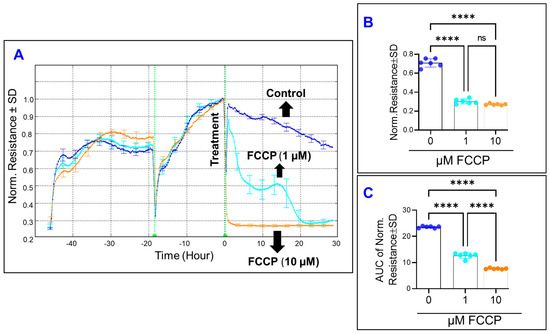We subsequently assessed the effect of OxPhos uncoupling on the total electrical R across the HRECs as an index of their overall barrier functionality. To achieve this goal, the optimum frequency corresponding to the maximum total R was chosen to be 4000 Hz based on our previous study [16]. HRECs were then treated with FCCP and the total R was measured for 30 h after treatment. As shown in Figure 3A, and in contrast to the effect of FCCP on the C, FCCP at 1 µM exhibited a characteristic R curve which started with a decrease in the initial R reading until reaching a momentary minimum, then decreased again to a minimum R, and then plateaued for the remainder of the experiment. However, treatment with a higher concentration of FCCP (10 µM) caused an immediate and sharp decrease in the R curve, followed by reaching a plateau phase as early as 1–2 h. Both concentrations of FCCP caused statistically significant decreases in HRECs’ R at the end of the experiment, but without a clear dose-related trend (Figure 3B). Instead, a dose-dependent effect of FCCP on decreasing HRECs’ R was seen by calculating the AUC (Figure 3C), where each treatment group experienced decreases in R at a significantly different rate.