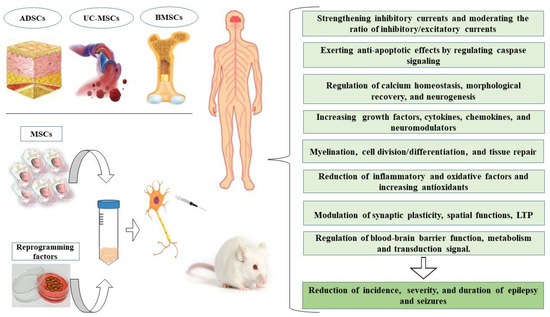 The potential beneficial effects of mesenchymal stem cells (MSCs) in the treatment of epilepsy. BMSCs, bone marrow mesenchymal stem cells; ADSCs, adipose-derived stem cells; UC-MSCs, umbilical cord-derive, LTP, long-term potentiation.