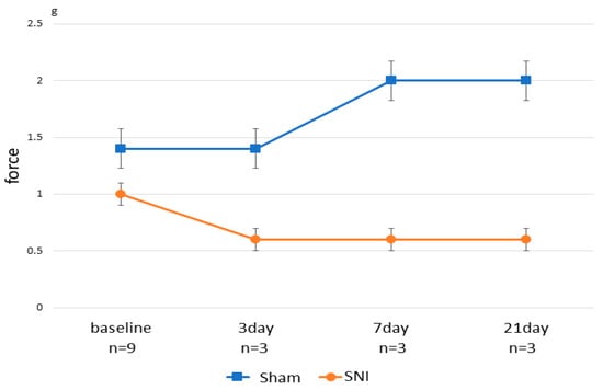 Time series results of the von Frey behavior test. The vertical axis represents the minimum force (g) at which mice responded positively in behavioral tests. The baseline is the value of behavioral tests before SNI or Sham treatment. Behavioral tests on Days 3, 7, and 21 were performed before the sacrifice, respectively.