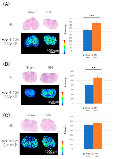 2-AG distribution in the lumbar spinal cord cross-section. (A) On day 3 post-treatment, 2-AG level was increased by 1.34-fold (p = 0.002) in the SNI group compared to the sham group. (B) On day 7 post-treatment, 2-AG level was increased by 1.39-fold (p = 0.008) in the SNI group compared to that in the sham group. (C) On day 21 post-treatment, 2-AG level increased by 1.08-fold in the SNI group compared to that in the sham group (p = 0.211). *: p < 0.05,**: p < 0.01.
