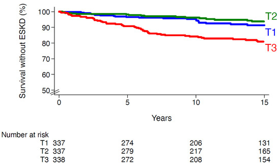 Survival without end-stage kidney disease according to tertiles of redox genetic risk score. T1, first tertile; T2, second tertile; T3, third tertile. Log-rank p-value < 0.0001.