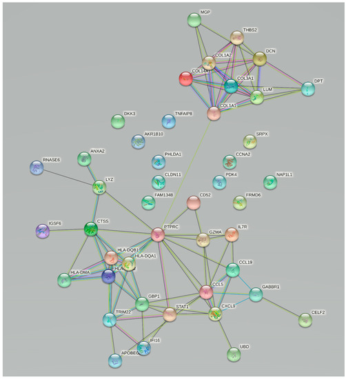 The set of DEGs was used to construct a protein–protein interaction (PPI) network. The PPI network was constructed with STRING v11 under the cut-off interaction score of 0.4 and with active interaction sources, such as Textmining, Experiments, Databases, Co-expression, Neighborhood, Gene Fusion, Co-occurrence (https://string-db.org/, accessed on 3 December 2020).