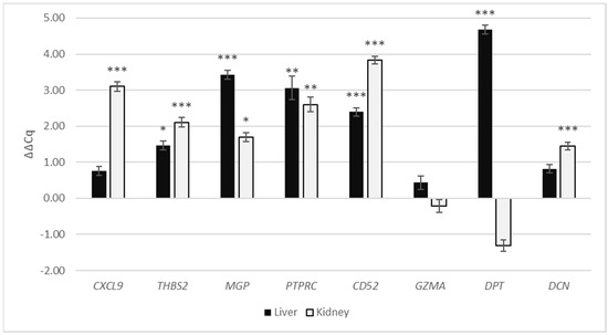 Gene expression of CXCL9, THBS2, MGP, PTPRC, CD52, GZMA, DPT and DCN in fibrotic kidney and liver expressed as ΔΔCq relative to normal kidney and liver, respectively.