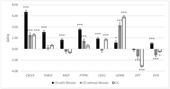 In CD with fibrosis in the colon, the expression of genes CXCL9, THBS2, MGP, PTPRC, CD52, GZMA and DCN (ΔΔCq = 6.73, p < 0.001; ΔΔCq = 3.08, p < 0.001; ΔΔCq = 1.66, p < 0.001; ΔΔCq = 3.55, p < 0.001; ΔΔCq = 1.90, p < 0.001; ΔΔCq = 1.17, p = 0.03; ΔΔCq = 1.03, p < 0.001, respectively) was significantly up-regulated compared with normal colon, while the gene expression of DPT (ΔΔCq = −0.16, p = 0.91) was not significantly altered (Figure 3, Table 4).