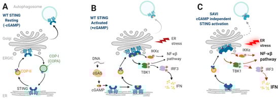 STING Signaling. (A,B) Upon DNA sensing by cGAS, cGAMP binds to wild-type (WT) STING. STING trafficks then to the Golgi and undergoes post-translational modifications. STING activation in the Golgi leads to type I interferon (IFN) production, NF-κβ pathway activation, and cell death induction through endoplasmic reticulum (ER) stress. STING trafficking is normally controlled through retro-transport to the ER via COPA and by trafficking to the autophagosome, where it is degraded. (C) When affected by a gain-of-function mutation, STING is constitutively activated in the Golgi in a cGAMP-independent manner and enhances constitutive type I IFN production through IRF3 phosphorylation and inflammatory cytokine production by activating the NF-κβ pathway. STING constitutive activation in the Golgi also induces ER stress, which can further lead to cell death. Finally, reduction of STING clearance by autophagy is described in the context of STING gain-of-function. Adapted from Frémond et al., J Clin Immunol, 2021. Created with biorender.com, accessed on 26 November 2021, last accessed on 13 January 2022.