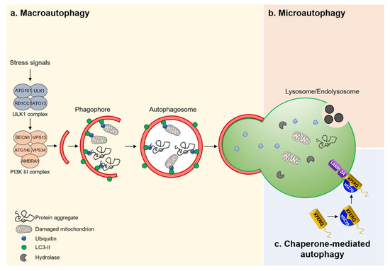 Three major routes for the delivery of autophagic cargos to endolysosomes have been reported: macroautophagy, chaperone-mediated autophagy, and microautophagy (Figure 2). Macroautophagy—the best-characterized form of autophagy—involves the sequestration of cellular material within a double-membrane vesicle, termed an autophagosome [40]. Induction factors and stress signals determine the choice of the autophagosome content that can proceed in a relatively nonselective manner, that is the bulk autophagy [41], or entail the tightly regulated disposal of individual cellular components [42]. For instance, mitophagy removes dysfunctional and/or damaged mitochondria; “ribophagy” for ribosomes; “pexophagy” for peroxisomes; “reticulophagy” specifically dismantles portions of the endoplasmic reticulum; ‘‘nucleophagy’’ parts of the nucleus; ‘‘aggrephagy’’selectively removes misfolded protein aggregates, ‘‘lipophagy’’ lipid droplets, and ‘‘xenophagy’’ specifically degrades intracellular bacteria that escape endosomes [42]. Irrespective of substrate specificity, selective autophagy relies on a set of cellular sensors that detect potentially dangerous cues and convert them into signals that are ultimately conveyed to the autophagic machinery [42].