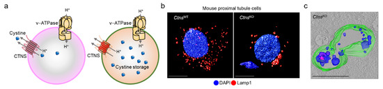 - Ivanova, E.A.; De Leo, M.G.; Van Den Heuvel, L.; Pastore, A.; Dijkman, H.; De Matteis, M.A.; Levtchenko, E.N. Endo-Lysosomal Dysfunction in Human Proximal Tubular Epithelial Cells Deficient for Lysosomal Cystine Transporter Cystinosin. PLoS ONE 2015, 10, e0120998. [Google Scholar] [CrossRef] [Green Version]