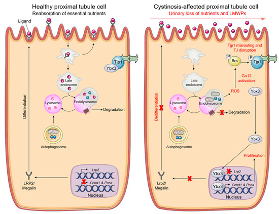 Recent insights have illuminated the biological functions of tight junction proteins in safeguarding the epithelial cell behavior and phenotype. In particular, tight junction adaptor protein 1 (Tjp1) represses the nuclear translocation of an Y box binding protein 3 (Ybx3) —a transcriptional factor that promotes cell proliferation while repressing PT differentiation during kidney development [104]. As oxidative stress damages tight junction integrity [105], the excessive mitochondrial ROS induced by cystinosin loss might trigger an abnormal activation of the tight junction associated Ybx3 (Y box binding protein) signaling, which would, in turn, lead to epithelial dysfunction in cystinosis PT cells. In line with this model, increased levels of mitochondrial ROS stimulate Gna12/Ga12-SRC-mediated phosphorylation of Tjp1 and its subsequent misrouting to enlarged, non-degradative endolysosomes. The disruption of tight junction integrity triggers the hyperactivation of tight junction-associated Ybx3 signaling, with increased proliferation (e.g., Ccnd1 and Pcna) and reduced apical differentiation (e.g., Lrp2), ultimately disabling receptor-mediated endocytosis and epithelial functions in CtnsKO cells [62,71] (Figure 4). Gain- and loss-of-function approaches targeting Gna12 or Tjp1 or Ybx3, or pharmacological interventions impeding activation of the Gna12-Src-directed signaling (e.g., with the mitochondrial-targeted antioxidant Mito-TEMPO or with the SRC inhibitor SU6656) restore epithelial functions in CtnsKO cells [62,71]. By regulating autophagy and the Tjp1-Yxb3 signaling, the crosstalk between cystinosin and the endolysosome system might thus dictate the balance between proliferation and differentiation of PT cells, and hence their role in homeostasis.