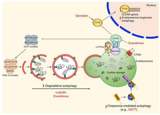 Despite normal mTORC1 activity in cystinotic iPSCs and their derived kidney organoids, the molecular mechanisms behind the beneficial effects of the combo treatment remain largely elusive. In this setting, a potential mediator could be the activation of TFEB—a master regulator that controls the expression of the genes involved in autophagy and endolysosome biogenesis [2,34,35] (Figure 5). Recent work showing that cystinosin might physically interact with many components of the v-ATPase–Ragulator–Rag complex [110,111], which regulates the mTORC1 lifetime and its activation at the surface of the endolysosome, and that the reconstitution of TFEB signaling stimulates the catabolic properties of endolysosomes and the completion of autophagy in conditionally immortalized PT epithelial cells (ciPTEC) derived from the urine of a cystinotic patient [92], further substantiate the concept. Indeed, the pharmacological induction (e.g., genistein) of nuclear translocation and the activation of TFEB-dependent transcriptional programs has recently been shown to empty cystine storage, to restore the functioning of endolysosomes and degradative autophagy, and to improve the processing of endocytosed cargos in cystinotic ciPTEC [92] (Figure 5).