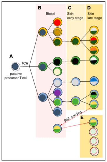 Suggested model of migrating malignant cells in CTCL. As a result of circulating and self-seeding malignant cells to other lesions, intra-patient heterogeneity may occur. (A) A putative precursor of a malignant T-cell undergoes malignant transformation before TCR-beta rearrangement, showing clonotypic heterogeneity (different cytoplasm colour). (B) In the blood the precursor expands and accumulates mutations, leading to different subclones (different colour of nucleus). (C,D) Lesions are seeded by malignant T-cells, where they progress malignancy and develop new subclones while disease further develops. (E) Some malignant cells may re-enter the circulation to self-seed into other lesions, increasing heterogeneity and disease progression. Reprinted with permission from ref. []. Copyright © 2020 American Society of Hematology.