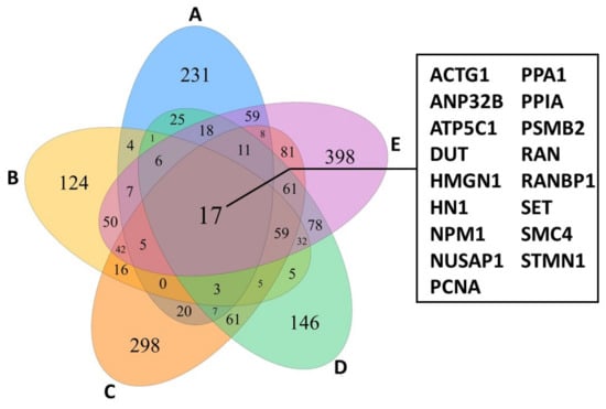 Venn diagram of proliferating lymphocytes from CTCL-lesions of 5 different patients (A–E) showing an overlap of 17 genes highly while only minor expression is observed in controls. The figure was created with specifications from [].