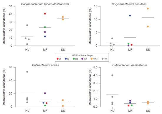 Besides Staphylococcus aureus, other organisms may also be linked with CTCL. Harkins et al. [] found two corynebacteria to trend higher, whereas two cutibactactial species exhibited decreased abundances on CTCL lesions. Bacterial shifts seem to correlate with disease stage. HV = Healthy Volunteer. Reprinted with permission from ref. []. Copyright © 2021 Elsevier.