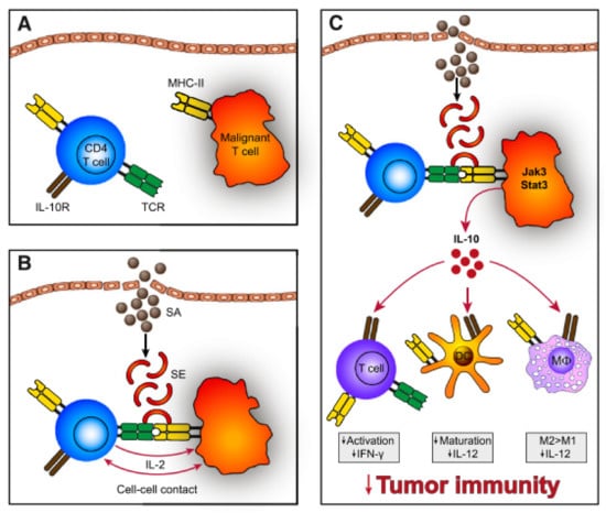 (A) Malignant T-cells often express a monoclonal TCR-V-beta chain with decreased function of the whole TCR complex. Hence, SEs do not stimulate the TCR directly but through activation of benign T-cells. (B) SEs bind to MHC II expressed on malignant T-cells, which crosslink to TCR of benign T-cells. Subsequently, establishing T-T-cell interaction and IL-2 is expressed. (C) These signals induce IL-10 expression, which dampens the immune response via impaired maturation of DCs, repressed expression of Th1 cytokines (interferon-g, IL-12), inhibition of T-cell activation and promoted development of M2 macrophages. Reprinted with permission from ref. []. Copyright © 2014 American Society of Hematology.