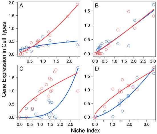 Li et al.’s data [3] comprised 17 female embryos sampled at a range of developmental stages from 4 to 26 weeks post-fertilization, which formed an early stage of primordial folliculogenesis. In each embryo, multiple subpopulations of cells were isolated to profile the transcriptomes of FGCs and somas by single-cell RNA-seq, obtaining a total of 1220 genes that are expressed jointly between the two interactive cell types. We took the expression mean of each gene over all cell subpopulations from each cell type, from which to calculate the NI of the gene on each embryo. By plotting the expression of each gene on each cell type against the NI across embryos, we found that this relationship can be reasonably fitted by a power equation (p < 0.05; Figure S1), although the form of curve fitting varied among genes and between cell type for the same gene (Figure 1). Thus, the power equation was used to model the independent expression component of Equation (2)’s qdODEs, but with the dependent expression component modelled by an LOP-based nonparametric approach. By estimating the independent and dependent expression component integrals of the same gene expressed on FGCs and somas, we characterized how the two cell types interact with each other, driven by individual genes.