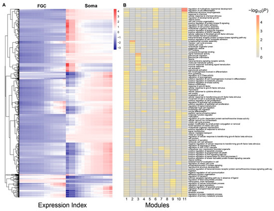Functional clustering of genes into 11 distinct modules based on the allometric scaling pattern of the expression of individual genes with EI across FGC and soma samples. (A) The heat map of differentiated gene expression by functional clustering. (B) GO analysis of genes from modules 1–11.