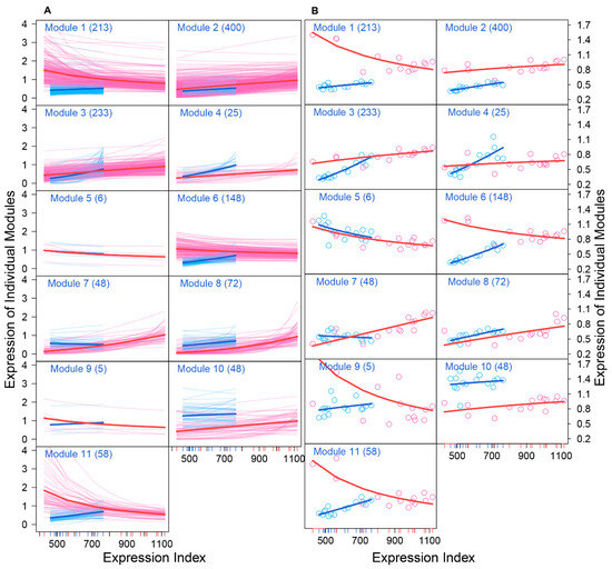 Distinct EI-varying pattern of 11 modules separately for FGCs (blue) and somas (red). (A) The change of expression of all genes within a module across EI. Thin lines denote the expression profiles of individual genes and thick lines are the average expression profiles of all genes from each module. (B) The fitness of averaged expression values of all genes from each module across EI. Each dot denotes the averaged expression value of genes on each sample.