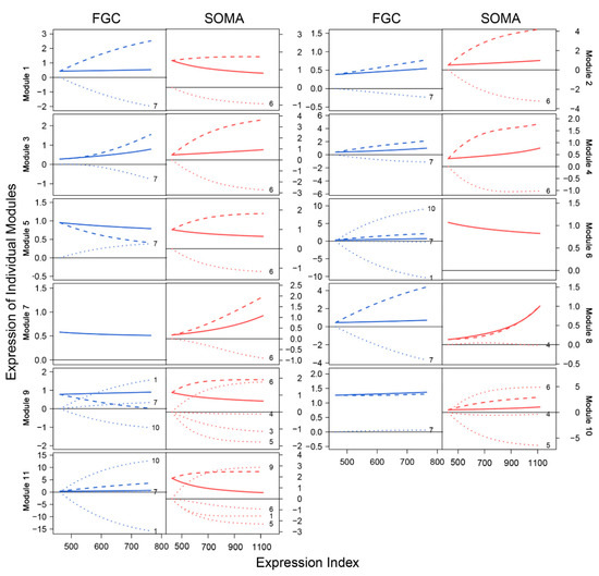 EI-varying changes of the overall gene expression of each module (solid line) and its independent (slash line) and dependent expression components (dot line) for FGCs (blue) and somas (red).