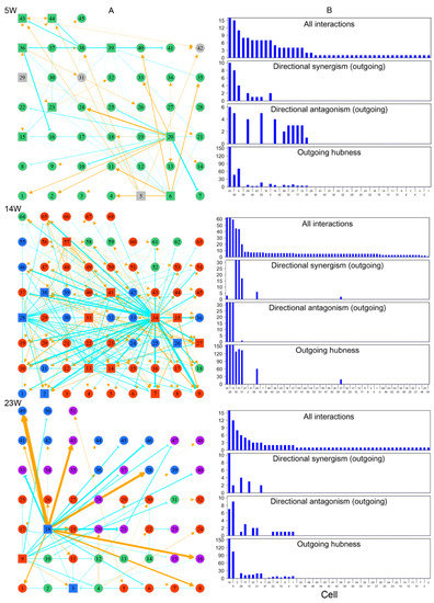 Networks of cell–cell interactions, guided by genes, at three different stages of embryo development (5, 14, and 23 weeks post-fertilization). (A) Topologies of time series of networks among randomly sampled cells. Cells in different FGC phases (determined by biomarkers) denoted with colored circles or squares (standing for hubs): green for mitosis, dark red for RA-responsive phase, light blue for meiosis, and purple for oogenesis. Gray color indicates cells whose phase cannot be determined. Yellow-orange arrowed lines and blue-green T-shaped lines denote promotion and inhibition, respectively. (B) The distribution of the number of all interactions, outgoing directional synergism, and outgoing directional antagonism and outgoing hubness across FGCs within the 5-week, 14-week and 23-week networks.
