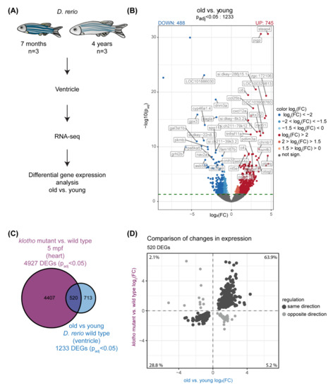 Transcriptional analysis identifies global changes in the aging zebrafish heart. (A) Scheme illustrating our transcriptome profiling approach with ventricles of 7-months (young) and 4-year (old) old zebrafish. n = 3. (B) Volcano plot illustrating differential gene expression (DEG) analysis that identified 1233 differentially expressed genes (DEGs); padj < 0.05 (dotted line). DEGs down-regulated in old vs. young are highlighted in blue (488), DEGs up-regulated in red (745). Gene symbols of top 50 DEGs (most significantly changed) are shown. FC: fold change. (C) Comparison DEGs in old vs. young with DEGs in hearts of klotho mutant vs. wild type [32] identifies 520 overlapping genes (D) 92.7% of 520 overlapping genes (in dark grey) are regulated in the same direction in old vs. young and mutant vs. wild type.