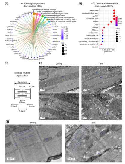 To assess the relevance of our gene expression dataset, we next compared our 1233 DEGs in old versus young ventricles with genes identified as differentially expressed in the zebrafish klotho mutant, a genetic aging model [32]. The hormone alpha-Klotho regulates lifespan in mammals and zebrafish, as respective mutants prematurely age [32,46]. About 42% of the DEGs of our study were also found to be differentially expressed in hearts of klotho mutants and 92.7% of those were regulated in the same direction in old versus young and klotho mutant versus wild types (Figure 1C,D, Table S2). This striking overlap suggests that these transcriptional changes can be considered major hallmarks of the aging zebrafish heart. In order to identify processes that might be associated with the changes in gene expression, we performed a gene ontology (GO) enrichment analysis. Biological processes associated with the 488 down-regulated DEGs in the fish ventricle were mainly linked to actin-related terms and muscle components were among the enriched cellular compartments associated to those DEGs (Figure 2A,B, Tables S3 and S4). Electron microscopy confirmed that muscle organization is affected in old zebrafish ventricles. While in young muscle tissue, a very regular, compact and evenly spaced sarcomere structure could be observed, muscle tissue from old fish was less uniform and showed more gaps. Mitochondria in old tissue were also interspersed in a more irregular fashion (Figure 2C–E).
