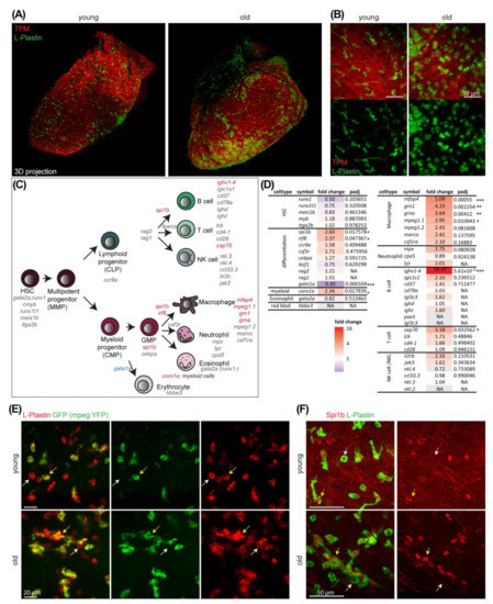 Immune cells accumulate in ventricles upon aging. (A) Whole-mount immunostaining of old (4 years) and young (1 year) fish hearts for the pan-leukocyte marker L-Plastin (green) and the muscle marker Tropomyosin (TPM) (red) are shown. Lightsheet microscopy and 3D projection reveal increased cell numbers and cell cluster formation in old hearts. (B) Higher magnification images of old and young hearts stained with L-Plastin (green) and TPM (red) reveals that immune cell numbers increase and cell morphology changes to be more roundish in old hearts. Scale bar: 50 µm. Whole-mount immunostaining and lightsheet microscopy. (C) Scheme of different immune cell types and their respective lineages in zebrafish. Known marker genes for different cell populations as well as for differentiation into specialized cell types are listed. Genes with significantly up or down regulated expression in old are highlighted in red or blue, respectively. (D) Immune cell markers (from (C)), their respective fold change with age and adjusted p-value (padj) are listed (transcriptional profiling from Figure 1, n = 3). Fold change values are color-coded with up in red, no change white and down in blue. NA: not available. *: padj < 0.05; **: padj < 0.01, ***: padj < 0.001 (E) Whole-mount immunostaining of young (1 year) and old (3 years) fish hearts of a mpeg:YFP reporter line for the pan-leukocyte marker L-Plastin (red) and GFP (green) reveals that a large subset of L-Plastin+ cells are mpeg-positive. White arrow indicates a single positive immune cell and yellow arrow indicates a double positive cell. Lightsheet microscopy. Scale bars: 20 µm. (F) Whole-mount immunostaining of young (1 year) and old (4 years) fish hearts for the pan-leukocyte marker L-Plastin (green) and Spi1b (red) reveal large subset of L-Plastin cells are Spi1b-positive. White arrow indicates a single positive immune cell and yellow arrow indicates a double positive cell. Lightsheet microscopy. Scale bars: 50 µm.