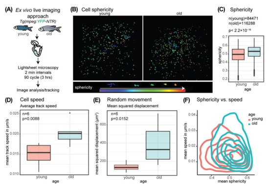 Macrophage morphology and behavior changes with age. (A) Schematic overview of the ex vivo live imaging approach using a reporter line expressing YFP under the control of the mpeg1.1 promoter (B) Sphericity of segmented and tracked objects (mpeg+ cells) at timepoint (tp) = 1 is color coded with red as high sphericity (round) and purple/blue as low sphericity. Age young: 12 months, age old: 4 years 7 months. The legend includes a color code for sphericity and representative example cell shapes. (C) Comparison of sphericity of all tracked objects (mpeg+ cells) at all time points analyzed in old and young fish hearts reveals a significant shift to higher average cell sphericity in the old. Welch two-sample t-test p < 2.2 × 10−16, age young: 3 × 6 months and 3 × 12 months, age old: 3 × 4 years 7 months and 3 × 5 years. (D) The boxplot illustrates the mean track speed of all segmented tracks analyzed per biological replicate. 6 old and 6 young hearts were analyzed. Quantification of average speed of mpeg+ cells in old and young fish ventricles indicate a faster cell movement in old. n = 6; two-sample t-test p = 0.0088, age young: 3 × 6 months and 3 × 12 months, age old: 3 × 4 years 7 months and 3 × 5 years. (E) The boxplot illustrates the average mean squared displacement analyzed per heart of 6 old and 6 young hearts. Quantification of mean squared displacement of mpeg+ cells in old and young ventricles reveals a higher random movement in old. n = 6, Wilcoxon rank sum test p = 0.0152, age young: 3 × 6 months and 3 × 12 months, age old: 3 × 4 years 7 months and 3 × 5 years. (F) Density plot showing the average cell sphericity per track vs. average speed per track reveals a shift of cell populations in old towards more roundish and to faster cells.