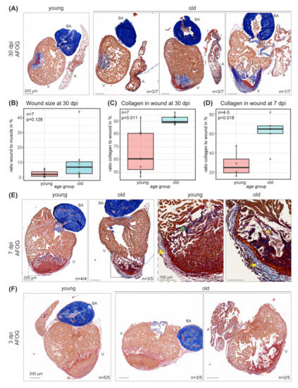 Wound size, regeneration response and collagen deposition changes upon cryoinjury in old compared to young hearts. (A) Acid fuchsin orange G (AFOG) staining of representative sections of young and old hearts 30 dpi visualizes the scar area in red (fibrin) and blue (collagen). Intact muscle is stained in orange. Scars display strong differences within the old (3 years 10 months) population as compared to young (1 year 4 months). 4 out of 7 old fish show differences in the injury response compared to young. Scale bars: 200 µm. (B) Quantification of the wound as percentage of intact muscle at 30 dpi (from (A)). n = 7. Wilcoxon rank sum test p = 0.128. (C) Quantification of collagen in wound (in %) at 30 dpi (from A). n = 7. Wilcoxon rank sum test p = 0.0111. (D) Quantification of collagen in wounds (in %) at 7 dpi (from (E)). n (young) = 4; n (old) = 5; two-sample t-test p = 0.0177. (E) AFOG staining of sections of young (1 year 2 months) and old (4 years 4 months) hearts 7 dpi visualizes the scar area. Scars display differences in young and old (3 out of 5 old). Yellow arrow points towards thickened collagen layer in the region of the epicard. Green arrow points towards collagen accumulation at the wound border in young. Yellow asterisk marks loosened muscle structure. Scale bars: 200 µm in overview and 100 µm in zoom-in. (F) AFOG staining of sections of young (9 months) and old (3 years 2 months) hearts 3 dpi visualizes the injured area. A subset of old animals (2 out of 5) show differences in the injury response. Scale bars: 200 µm. A: atrium; BA: bulbus arteriosus; V: ventricle. dpi: days post cryoinjury.