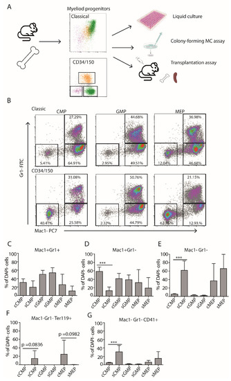 A number of studies published in recent years have claimed that phenotypic CMPs might not be an actual population [12,13,14]. However, isolation of various myeloid progenitor sub-populations is problematic not only because of that, but, more basically, because there is not an easy way to determine borders between the putative MEPs, CMPs, and GMPs [6]. This is not a concern within one study but might be an obstacle for meta-analysis of independent studies. Here we demonstrate that, by using the CD34 and CD150 surface markers, we were able to divide the LK compartment into three distinct sub-populations of CD34−CD150−, CD34midCD150+, and CD34+CD150− (which we called sMEP, sCMP, and sGMP, respectively, in contrast to cCMP, cGMP and cMEP gated by CD34/FcγR). We further characterize the potential of the newly-obtained populations and compare them to the “classical” ones, using short-term transplantations, liquid cultures, and methylcellulose colony-forming assays. This novel approach relies on markers commonly used by hematopoiesis researchers and might help improve the reproducibility of independent studies.