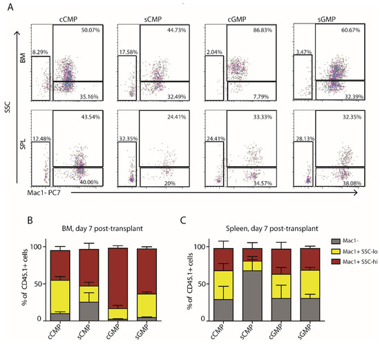 We also wanted to test the potency of the LK sub-populations in vivo. For this purpose, we performed transplantations of CD45.1 donors into non-irradiated CD45.2 congenic hosts, following a recently published study [17] (Figure 4 and Supplementary Figure S3). Importantly, we did try transplantation into lethally irradiated recipients. Still, in agreement with Yanez et al., we observed a significant difficulty with this extreme perturbation that induces severe inflammation in the recipient mice. We extracted spleens and BM from recipients seven days after transplantation and stained them for lineage markers (Mac-1, CD41, and Ter-119). Transplantation of either cMEPs or sMEPs did not yield sufficient CD45.1+ progeny for analysis (data not shown). The recipients of either cCMP, cGMP, sCMP, or sGMP showed mixed donor-derived progeny with some differences in their relative frequencies (Figure 4A–C). sCMPs produced slightly more Mac-1− progeny in the BM and the spleen (Figure 4B,C). Both cGMPs and sGMPs produced a little more Mac-1+ SSChi granulocytes than their respective CMPs in the BM (Figure 4B). Dissection of the BM Mac-1− population by CD41 and Ter-119 suggested that CMPs sorted by either approach had comparable erythroid/megakaryocyte potential higher than that of their respective GMP counterparts (Supplementary Figure S3). In the spleen, the cGMPs seemed to produce more erythroid/megakaryocyte progeny than the sGMP, but the difference was not significant, cCMP and sCMP were again comparable (Supplementary Figure S3). Taken together, these data suggest comparable differentiation potency of either CD34/CD150 or CD34/FcγR sub-populations of the LK compartment upon transplantation into non-irradiated hosts.