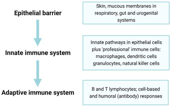 Immunosenescence, the ageing of the immune system, is closely related to inflammageing. With time, the immune system becomes less responsive to pathogens, and vaccine efficacy is also often reduced with age []. The ability to initiate acute inflammation has survival benefit, and a lack of responsiveness to acute inflammation is associated with higher blood CRP levels and increased mortality risk []. This failure results in increased susceptibility to various infectious diseases, including common infections that are relatively harmless in healthy adults (for example, influenza infections do not markedly differ between old and young people, but deaths from influenza are greatly elevated in the elderly [,,]). Immunosenescence and the failure of protective innate responses may also contribute to the high mortality of older adults on SARS-CoV2 infection []. Below, we discuss dysfunction of various components of the immune system, including barriers, innate immune cells, and the adaptive immune system (Figure 3) in terms of ageing and senescence.