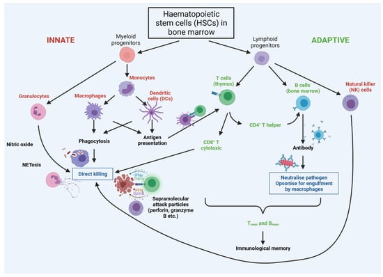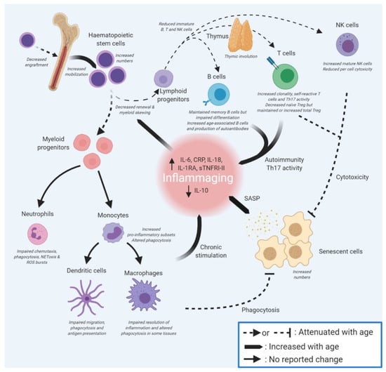 All professional innate and adaptive immune cells originally arise from haematopoietic stem cells (HSCs) in the bone marrow (Figure 4). With increasing age, HSCs become less quiescent [] and even though they increase in number [,], they exhibit a functional decline in regenerative potential [,,], possibly through telomere-driven replicative senescence. The capacity of aged transplanted HSCs to home to the bone marrow is also greatly decreased compared with young HSCs [,], suggesting intrinsic impairment of aged HSCs. By contrast, the mobilisation of hematopoietic stem and progenitor cells from the bone marrow to peripheral blood was greater in old versus young mice, possibly as a consequence of reduced adhesion to stroma []. These defects might arise from the accumulation of DNA damage, epigenetic changes, increased ROS production, altered proteostasis (all features of cell senescence), and/or changes in cell polarisation [,,].
