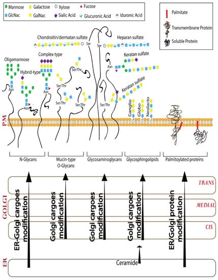 Cargo processing in the Golgi. N-glycosylation, mucin-type O-glycosylation, glycosaminoglycan, and glycosphingolipid pathways are 4 of the 16 distinct glycosylation pathways that modify cargoes passing through Golgi and modulate signaling from PM. Golgi apparatus is also the major palmitoylation location in the cell. While some of the processing reactions happen exclusively in the Golgi apparatus, some of them are shared between ER and Golgi as shown.