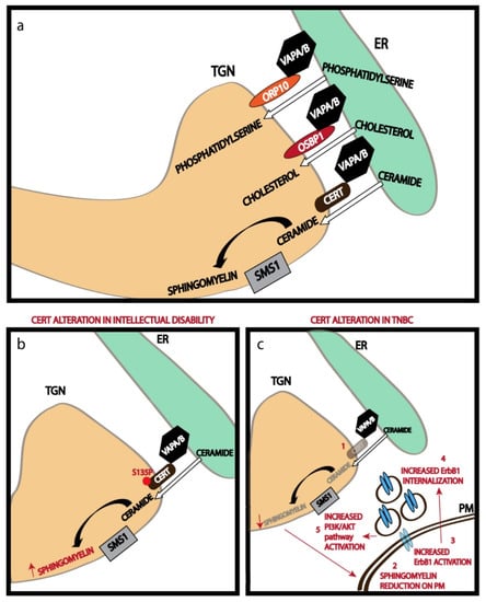 Non-vesicular transport of lipids at the TGN. (a) LTPs acting at the ER-TGN MCSs transfer the indicated lipids from the ER to TGN, where they can be further metabolized as in the case of ceramide which is converted to Sphingomyelin. (b) A mutation in CERT hyperactivates it, thus increasing the production of Sphingomyelin, which is associated with intellectual disability. (c) CERT alteration in triple negative breast cancer cells reduces its activity and hence Sphingomyelin production, which leads to a cascade of events culminating in increased PI3K/Akt activation.