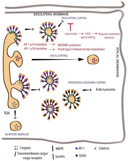 Impaired TGN sorting leads to improper PM composition that in several instances results in pathological consequences. For example, the distal determinant for basolateral targeting of LDLR is mutated (G823D) in patients with familial hypercholesterolemia–Turku variant []. This mutation leads to missorting of LDLR to apical surface of epithelial cells and bile canicular surface in hepatocytes. The decreased presence of LDLR in basolateral surface results in reduced cholesterol clearance from blood leading to hypercholesterolemia (Figure 3) []. The mutation is μ1A and μ1B subunits of AP-1 lead to MEDNIK syndrome and fried-type X-linked mental retardation respectively (Figure 3) []. These diseases are associated with common symptoms, including intellectual disability and neurological abnormalities. In addition, likely due to the subunit specificity of signal binding, they also have some specific symptoms. MEDNIK, for instance, is also associated with enteropathy and skin disorders []. These consequences are likely due to the impaired polarized sorting of cargoes mediated by AP-1 subunits, but needs experimental evaluation. Mutations in the subunits of AP-4 cause neurodevelopmental disorders with characteristics of hereditary spastic paraplegia in humans []. This disease is associated with microcephaly, cerebral palsy, and profound intellectual disability. It has been shown that in the purkinje neurons of these patients, Delta2 transport to dendrites is decreased []. Studies have also shown that colonic mucosa from Crohn’s patients showed reduced levels of μ1B mRNA and some colorectal cancer tissues also have shown reduced μ1B mRNA []. While these changes are consistent with the observed pathology based on mouse KO studies, whether they contribute to the pathology needs to be investigated.