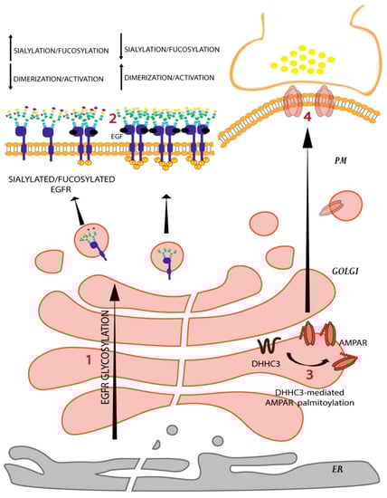 Golgi glycosylation and palmitoylation affect protein localization and function processing reactions in the Golgi,= determine the sialylation and fucosylation levels of EGFR. Increased sialylation or fucosylation reduces EGFR dimerization and activation (1) while reduced sialylation or fucosyaltion promotes it (2). The glutamate-gated ion channels AMPARs are made by different combinations of four subunits, GLUA1-4, each of which is palmitoylated. Palmitoylation of GLUA1 and GLUA2 is mediated by the Golgi resident palmitoyltransferase DHHC3 (3) and causes AMPAR retention in the Golgi and reduction of its expression at PM (4). This in turn impacts synaptic plasticity.