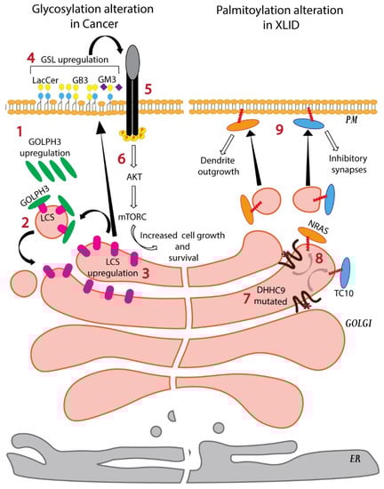 Impaired Golgi processing results in pathological conditions. The peripheral membrane protein GOLPH3 is upregulated in several solid tumours and promotes mitogenic signaling and cell proliferation (1). GOLPH3 binds LCS and a subset of other GSL biosynthetic enzymes, and promotes their entry into COPI vesicles for intra-Golgi retrograde trafficking and thus preventing their transport to lysosomes (2). This increases the levels of these enzymes in the Golgi thus promoting the biosynthesis of GSLs (3). Increased GSLs in the PM (4) likely increase the activity receptors in the PM (5) and that lead to increase mTOR signaling in the cell and increased cell growth (6). The palmitoyltransferase DHHC9 controls both dendrite outgrowth and inhibitory synapses in neurons and therefore its activity is required to maintain a balance between excitatory and inhibitory synapses. It acts by palmitoylating the GTPases NRAS and TC10, respectively, and localizing them to PM. Loss-of-functions mutations in DHHC9 found in patients with X-linked intellectual disability (XLID) (7) impairs the palmitoylation of NRAS and TC10 (8) and likely affects their PM localization (9). This impairment likely contributes to XLID and epilepsy.