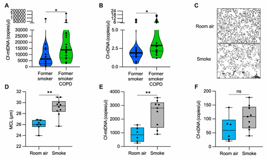 cf-mtDNA is elevated in the plasma of former smokers with COPD and in the serum of a mouse model of emphysema induced by CS exposure. (A) Cell-free mitochondrial DNA (cf-mtDNA) and (B) cell-free nuclear DNA (cf-nDNA) levels in the plasma of former smokers without airway obstruction (n = 14) and former smokers with COPD (n = 20); (C) representative images of modified Gill’s stained lung tissue shown in black and white as the threshold for the analysis (original magnification 200×); (D) mean chord length (MCL) quantification of mice exposed to cigarette smoke (n = 10) or room air (n = 7) for six months; (E) cf-mtDNA and (F) cf-nDNA in the serum of mice exposed to cigarette smoke (n = 9) or room air (n = 6) for six months. Data are shown in the (A,B) truncated violin or in the (D–F) box and whiskers plots, with circles representing individual samples. The bold horizontal bands in the (A,B) truncated violin plots represent the median (second quartile), and the dashed bands are the first and the third quartiles. ns, no statistical significance; * p < 0.05 and ** p < 0.01 were determined by an unpaired t-test.
